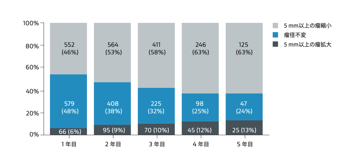 術後1か月時の瘤径をベースラインとし、5年間にわたり毎年のフォローアップでの瘤径変化を示しています。