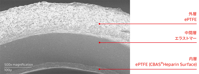 人工血管内腔のePTFE表面には、ヘパリンがエンドポイント共有結合技術によりボンディング(CBAS® Heparin Surface)されており、長期にわたる管腔内の抗血栓性が期待されます2 。