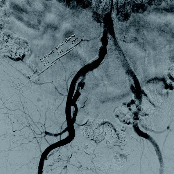腸骨動脈の血管内治療(EVT)は、高度石灰化病変が唯一のアキレス腱であったが、VBX ステントグラフトの登場により、さらにEVT が確立した領域となっている1。開存率がさらに安定した一方で、術後の出血イベントが生命予後に関連する報告があり、穿刺部出血を含めた管理が重要である2。本症例では高度石灰化病変に対し、ロープロファイル化されたVBX ステントグラフトを上肢からアプローチした症例を提示する。ポイントとして、独立リングのステント構造は上肢アプローチによる屈曲に対してもデリバリー性は非常に良好であった。また留置直前に6 Fr ガイディングシースからの造影もでき正確な位置決めが可能であったことは術者には心強い。一方でデフレーション後のバルーン離れが通常のステントとは異なる場合があるため、バルーンの完全収縮にはより時間をかけて対応することを勧める。
