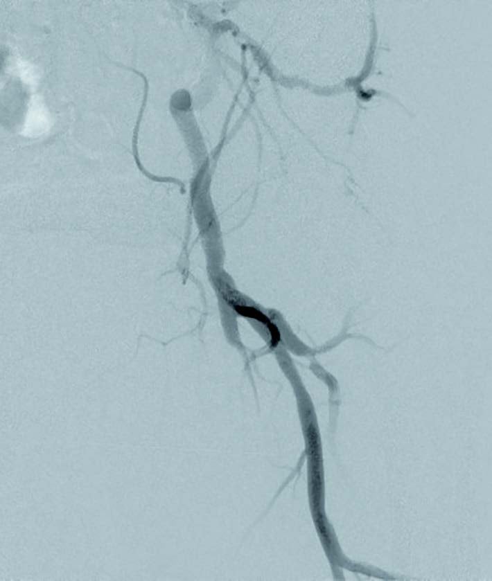 前拡張後の造影で温存したいコラテ部分に解離が認められ(図2)、また、IVUSでヘルシーランディングが可能な位置を確認したところ、遠位部のコラテ(図1矢印②)を温存してヘルシーランディングができることを確認できた。さらにIVUSで血管径を確認し、同等サイズのバイアバーン® ステントグラフトを留置した。バイアバーン® ステントグラフトが展開し始めた後、展開ラインをゆっくり連続した動作で引くようにするとバイアバーン® ステントグラフトの位置がずれることなく留置することが可能であった。その後、バイアバーン® ステントグラフト全長を同径のバルーンで高圧後拡張してIVUSでバイアバーン® ステントグラフトが充分拡張されていることを確認し、手技を終了した。(図3)