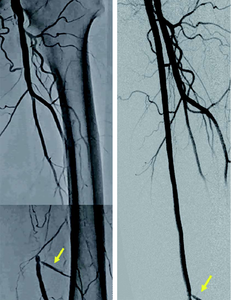 右浅大腿動脈閉塞(図3): 左鼠径部を穿刺(6 Fr シース)しcrossover後、順行性に0.014 inchマイクロカテーテルを使用して0.014 inch ガイドワイヤー(先端荷重1 g →3 g →40 g)を進めたが貫通できず、足背動脈を穿刺し逆行性に0.014 inch ガイドワイヤーを進め、貫通に成功。IVUS catheterで一部 subintimal trackingしていることを確認。5.0 mm 径バルーン(non-compliant balloon)で拡張後解離が生じ、末梢にバイアバーン® ステントグラフト5.0 × 150 mm、中枢に6.0 × 250 mm の2本を留置。病変の末梢には発達した2本の側副血行路を伴い、側副血行路の間に軽度狭窄病変を認めたため、中枢側の側副血行路をjailさせ、健常部にバイアバーン® ステントグラフトを留置。5.0 mm 径と6.0 mm 径バルーン(non-compliant balloon)で後拡張して終了。(図4)