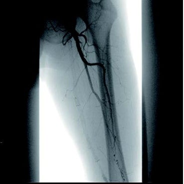 [背景] 左間欠性跛行で14年前に左SFAにベアナイチノールステント6 mm × 120 mm 2本が留置されている(図1)。約7年前に左間欠性跛行が増悪し、来院。外来での超音波検査でベアステントの完全閉塞を認めた(図2)。高度の跛行があり、再治療を実施した。
