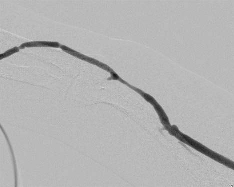 人工血管に 5-0 ナイロンでマットレス縫合をかけてその中心部を穿刺しシースを挿入して造影(図1)を行ったところ、人工血管 - 静脈側吻合部に有意狭窄を認めた。0.018 インチガイドワイヤー を通過させ同部をPTA バルーンカテーテル(カッティング型)でwaist が消失するまで拡張し狭窄を解除した(図2)。バルーン拡張術後の造影で同部のリコイル所見を認めた(図3)ため、ゴア® バイアバーン® ステントグラフト 7 mm 径× 50 mm 長を展開し、PTAバルーンカテーテルで後拡張を行った。最終造影でゴア® バイアバーン® ステントグラフトの良好な拡張(図4)を確認し、シースを抜去して先のマットレス縫合を結紮して手技を終了した。